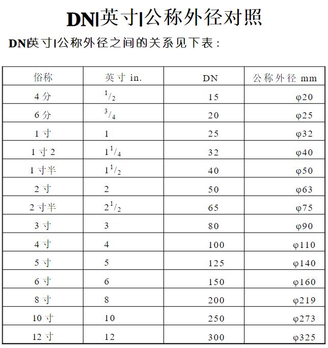 5、當(dāng)設(shè)計(jì)均用公稱直徑DN表示管徑時(shí),應(yīng)有公稱直徑DN與相應(yīng)產(chǎn)品規(guī)格對(duì)照表(參考下圖)。