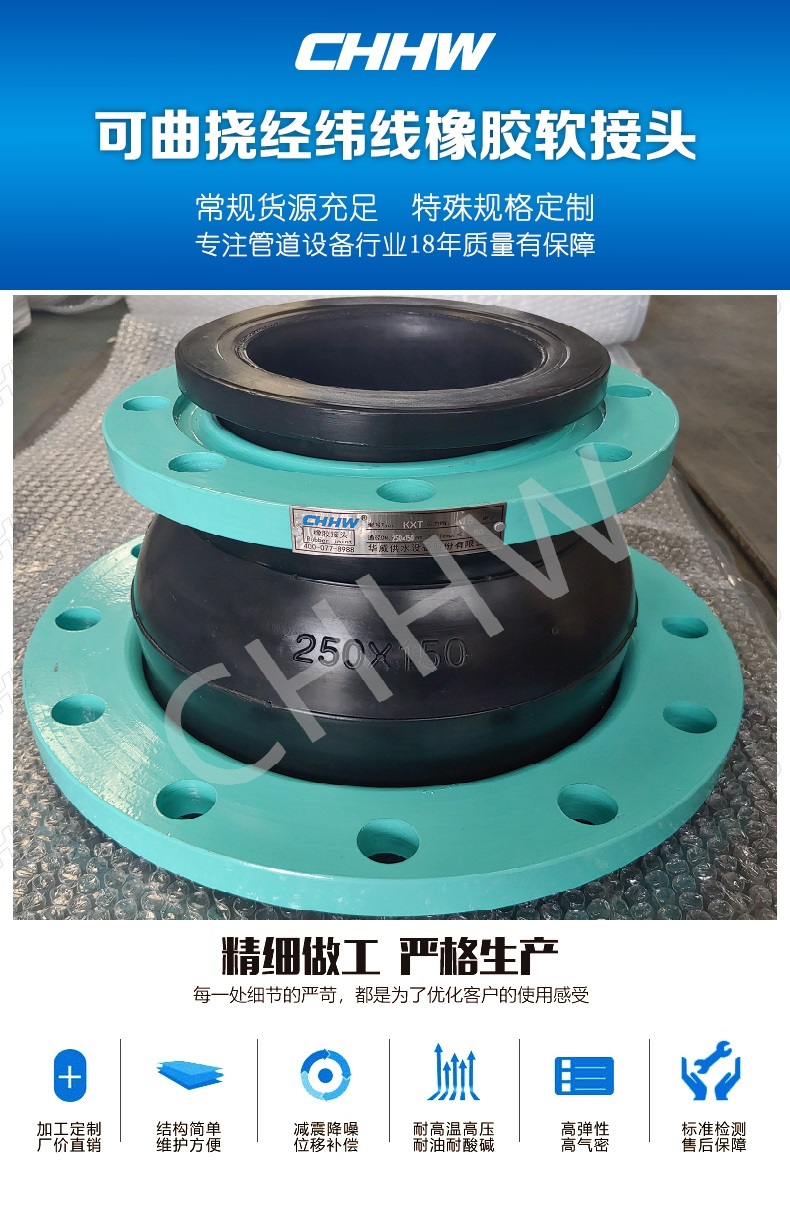CHHW華威牌可曲撓異徑橡膠軟接頭光澤度高,彈性好,膠質(zhì)不含再生膠,使用品牌天然橡膠(NR)、氯丁橡膠(CR)、氟橡膠(FKM)、輔料均為國(guó)內(nèi)外知名品牌,球體無(wú)異味,使用航空鋼絲銅焊成圈,固定硫化防脫盤(pán)能力出眾;耐老化程度是一般球體的5倍;先進(jìn)的自動(dòng)成型機(jī)成型,纏繞為實(shí)心纏繞法,耐高壓,試驗(yàn)壓力達(dá)50公斤,抗橫向拉力是手工成型的3倍;通過(guò)日本精度模具,自動(dòng)硫化機(jī)恒溫硫化制成,可以過(guò)水、蒸汽、弱酸堿等介質(zhì),杜絕球體冒汗現(xiàn)象,球體壽命可達(dá)≥5~10年。
